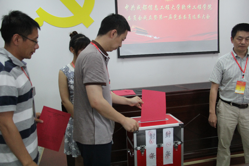 在雄壮的国歌声中,大会正式开幕。会上,马义华向大家报告了软件工程学院党委成立的有关情况以及学院第一届党委委员选举大会前期筹备工作情况,介绍了委员候选人预备人选的基本情况。经过预选选举(差额)和正式选举(等额)两轮选举,马义华、乔少杰、李蕊、唐聃、崔玥、梁淑珍、魏维(按姓氏笔画排序)等7名同志全票当选为中国共产党成都信息工程大学软件工程学院第一届委员会委员。