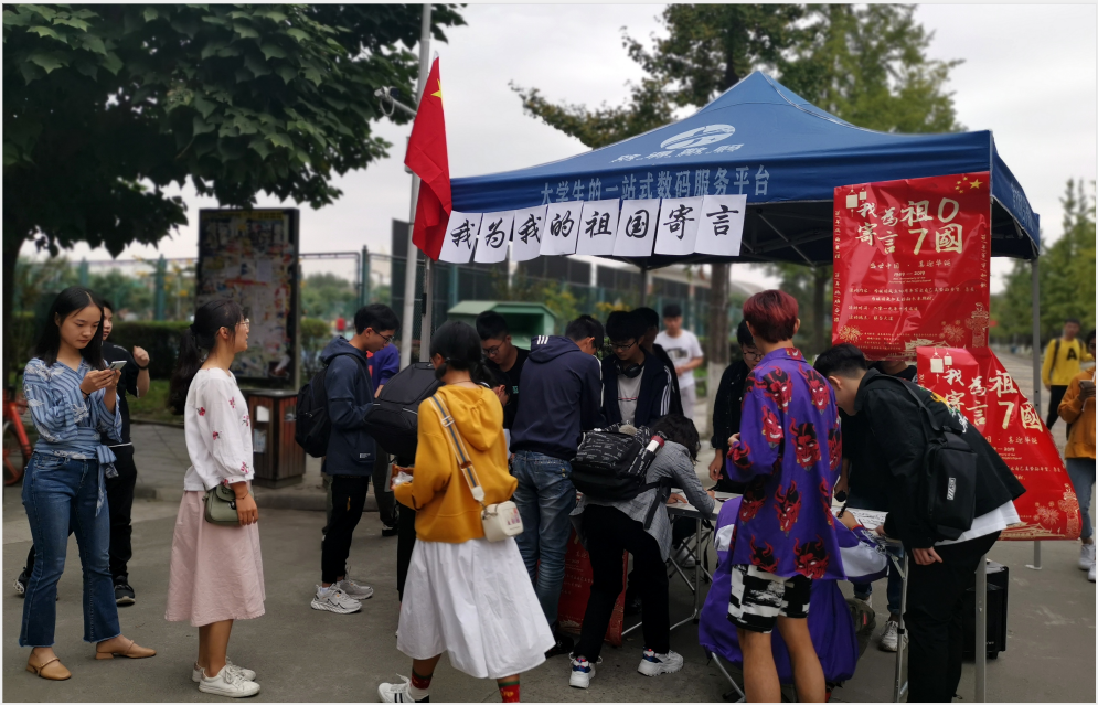 活动于下午5点开始,同学们首先以一曲热情洋溢的“我和我的祖国”拉歌开场,熟悉悠扬的歌声吸引路过的师生、家长以及其他群众纷纷前来,在同学们早已准备的名信片上写下了“此生无悔入华夏!”“我是中国人我骄傲!”等自己对祖国的真心祝福和爱国之情。其中最引人注目和最感动人的是一位70岁高龄的老人和一位拾荒老者的明信片,他们分别写下:“我爱我的祖国,祖国万岁!”“祖国强大了,更希未来强大!”