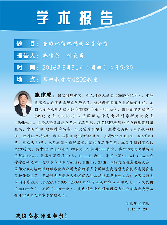 【讲座预告】资源环境学院举办“全球水循环观测卫星介绍”学术讲座