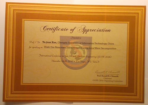 【本网讯】11月14日至16日,我校通信工程学院副教授薛雅娟博士应邀参加了“2016年天然气、石油和石油工程国际会议”(2016 International Conference on Gas, Oil and Petroleum Engineering,GOPE-2016),并作了题为“利用局部波分解方法进行页岩气储层描述”的主题报告,与众多学者和专家进行了讨论交流,研究成果在会上得到了很多研究者的关注和认可。