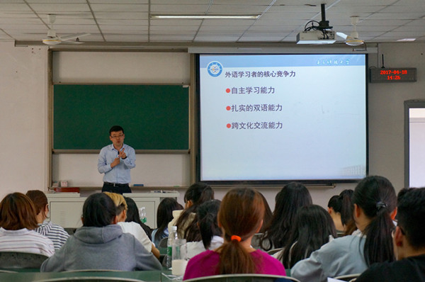 【本网讯】4月18日下午,电子科技大学外国语学院副院长胡杰辉教授应邀到我校参加“2017国际人才英语考试(ETIC)”宣讲活动,并作了题为《打造外语学习者的核心竞争力》的专题讲座。