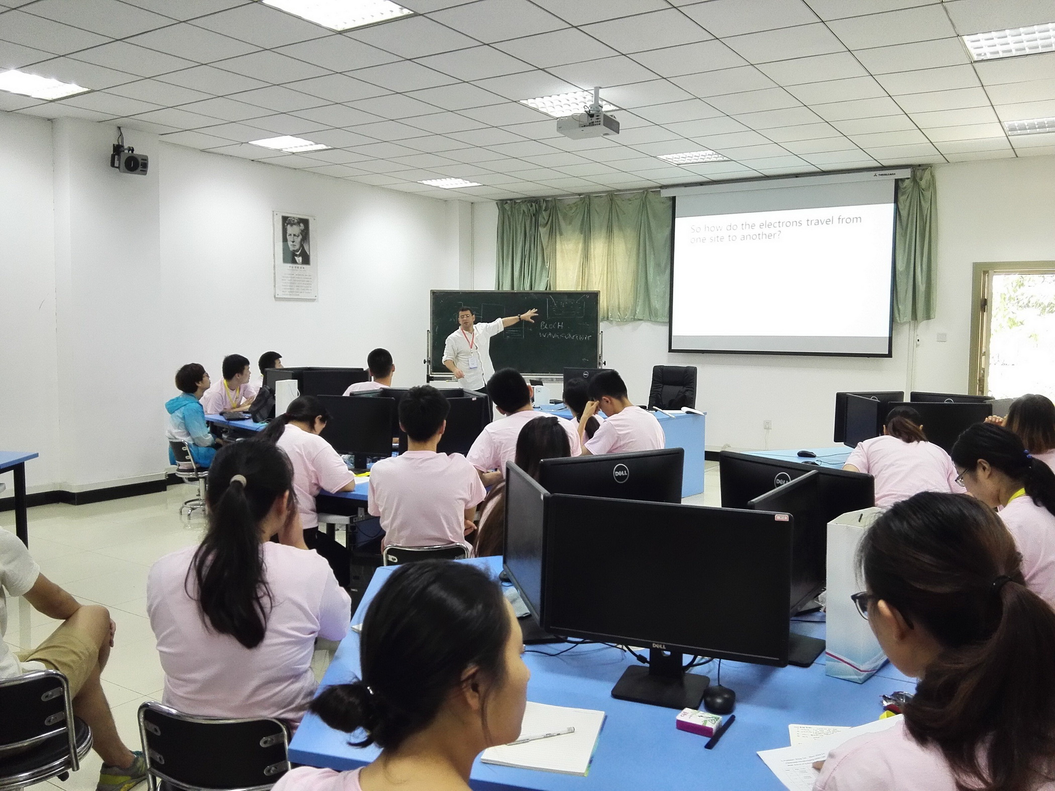 7月13日上午,光电技术学院特邀的来自英国伦敦大学玛丽皇后学院有机发光材料专家Theodoros Kreouzis博士在5106教室开始了本院国际教育周第一堂课程的讲授。授课内容为:有机电子学概述(Summaryof organic electronics)和分子能级(Molecular energy levels)。授课过程中,Theodoros Kreouzis从有机发光材料的应用举例出发,深入浅出地介绍了有机电子学(organic electronics)的涵盖范围,讲解了有机材料(organic materials)、二极管(diode)、HOMO(Highest Occupied Molecular Orbital)、LUMO(Lowest Unoccupied Molecular Orbital)等概念,并通过视频介绍了相关实验方法。同学们学习兴趣浓厚,学习热情高涨,课堂气氛十分活跃。
