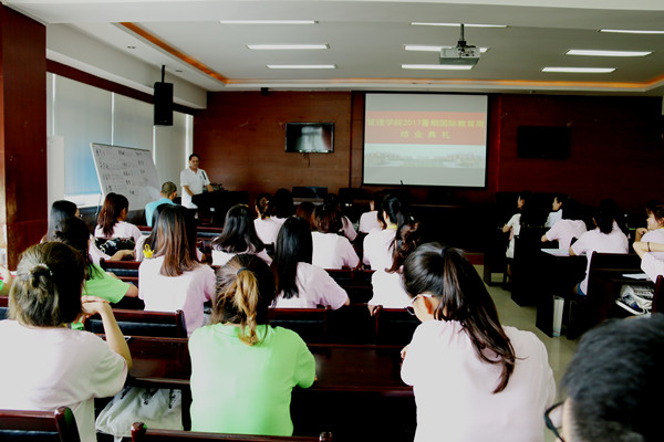 【本网讯】7月17日下午,管理学院在龙泉校区二会议室举行了2017年暑期国际教育周活动闭幕仪式。管理学院院长黄萍,副院长李贵卿、孙艳玲,党政办公室、教学办公室、学工办公室主任,教师代表以及全体学员参加了闭幕仪式。