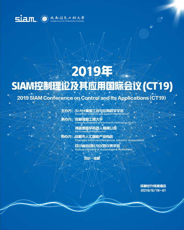 2019年SIAM控制理论及其应用国际会议(SIAMCT19)由美国工业和应用数学学会(Societyfor Industrial and Applied Mathematics,SIAM)主办,成都信息工程大学承办,将于2019年6月19日至21日在中国成都(成都世外桃源酒店)隆重举行。会议主要围绕控制理论及系统等问题展开讨论,旨在为控制领域的专家学者及企业提供一个分享研究成果、讨论存在的问题与挑战、探索前沿科技的国际性合作交流平台。