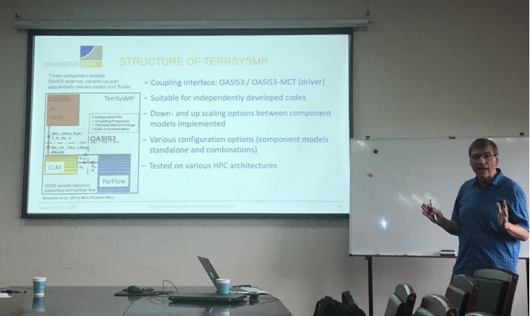 德国波恩大学Clemens Simmer教授对波恩大学的教学环境与教学特色作了介绍,分享了该校跨区域合作研究中心的工作进展,详细解释了波恩大学跨区域合作研究中心搭建的陆面系统模拟平台的模拟机制,并与在座师生积极互动,分享、探讨了数值模拟、物理过程参数化方案等方面的科学问题。