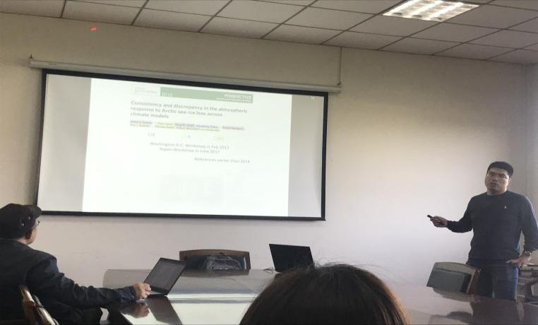 加州大学洛杉矶分校Pengfei Zhang博士作了题为“A stratospheric pathway linking a colder Siberia to Barents-Kara Sea sea ice loss”的学术报告,谈到了在全球变暖下近二三十年内出现气候变暖减缓甚至变冷的现象。通过分析发现随着海冰融化,平流层动力在放大和延长中纬度环流响应以及对欧亚大陆降温中起重要作用。