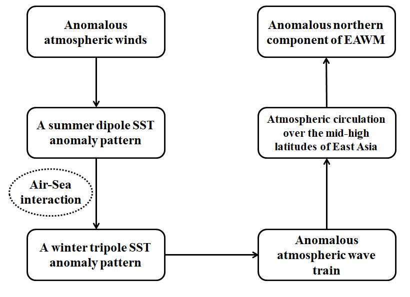 该研究发现东亚冬季风北分量的变化与前期夏季北大西洋偶极子海温异常密切相关,北大西洋海气相互作用以及北大西洋海温异常激发的异常大气波列在此过程中扮演重要角色。同时,东亚冬季风北分量与夏季北大西洋海温异常之间的关系存在年代际变化,两者关系在1970s末以前较弱,1970s末以后较强。