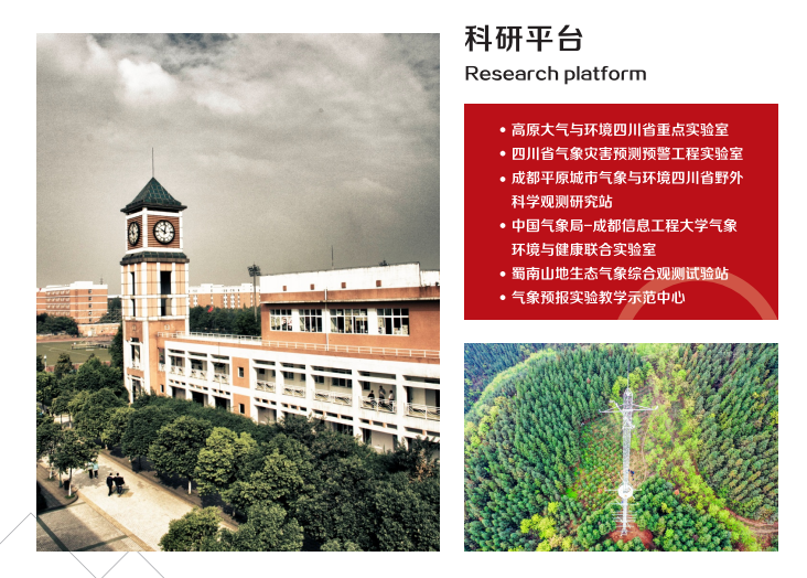 学院目前拥有高原大气与环境研究中心四川省重点实验室、四川省气象灾害预测预警工程实验室、成都平原城市气象与环境四川省野外科学观测研究站等省部级科研与创新平台,并建有气象预报四川省实验教学示范中心、气象预报四川省虚拟仿真实验教学中心以及蜀南山地生态气象综合观测试验站、西南空管局航空气象创新联合实验室、中电投电力工程有限公司电力气象联合实验室、成都信息工程大学云南自然灾害防御技术研发中心等教学研究平台。