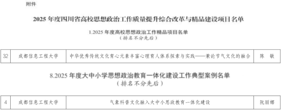彰显文化育人品牌。学校着力营造以大学精神为内核的校园主流文化氛围,凝练文化主题,精心打造出“国防绿文化”“励志文化”“志愿者文化”“青春榜样文化”等一批特色鲜明的校园文化品牌,曾获四川省、全国高校校园文化建设成果奖。其中,学校于2007年发起的“气象防灾减灾宣传志愿者中国行”活动已发展成为由国家多个部委主办、我校牵头承办、北京大学等全国20余所高校参与的全国性志愿者品牌活动。《强化实践育人 构建素质教育实践体系的研究与实践》获第七届高等教育四川省教学成果一等奖。学校成为四川省“三全育人”综合改革试点高校和首批四川省大中小学思想政治教育一体化基地,育人名片不断擦亮。