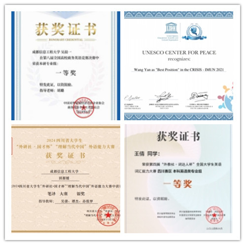 大学英语四六级通过率不断提升,专四、专八通过率也远超全国平均水平。学科竞赛成绩斐然,近几年有近100人次获得国家级奖励,超过650人次获得省级奖励。特别是1名同学在全球40多所高校参与的联合国教科文组织和平中心模拟联合国视讯辩论大会上获得best position,成为本届赛事中唯一获奖的中国大陆学生。大创项目取得新突破,学生科研能力得到显著提高。近几年立项的国家级、省级项目近20项,本科生发表论文超过100篇,数量和质量都大幅提升。毕业生考研率稳中有进,2024年超过20%的毕业生考研成功,部分同学成功进入985、211和国外知名大学继续深造。